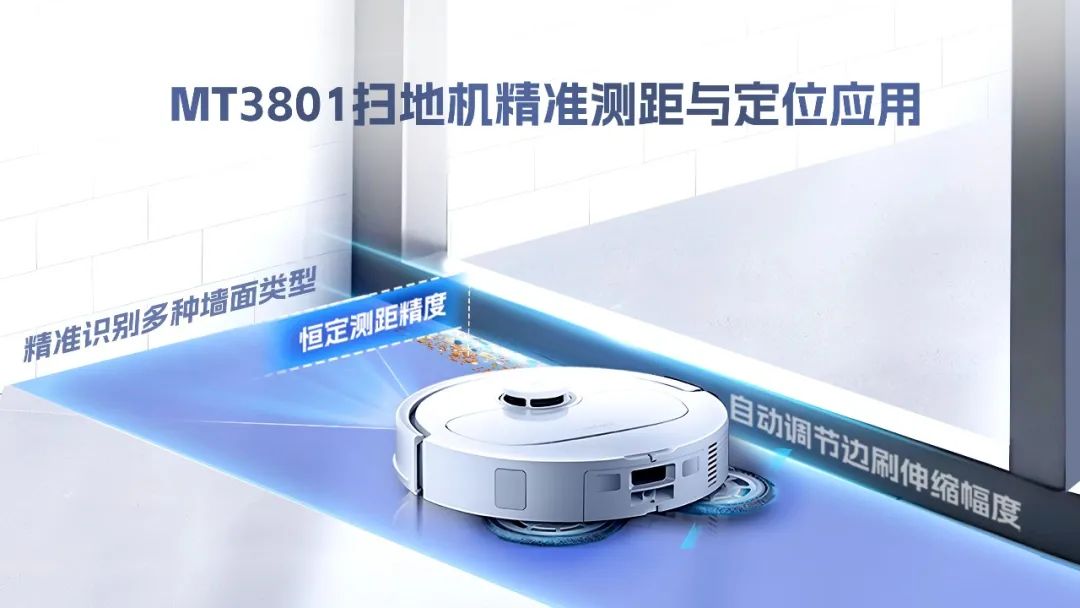 DTOF傳感器在沿墻模式下保持恒定測(cè)距精度,確保邊刷與墻面始終維持最佳間距,實(shí)現(xiàn)極限貼邊。同時(shí),基于實(shí)時(shí)距離反饋,系統(tǒng)自動(dòng)調(diào)節(jié)邊刷伸縮幅度,將墻角垃圾精準(zhǔn)掃入主吸塵通道,還可精準(zhǔn)識(shí)別多種墻面類(lèi)型(如踢腳線、玻璃幕墻、凹凸磚墻等),并自動(dòng)調(diào)整清潔策略。(點(diǎn)擊查看更多MT3801產(chǎn)品信息)