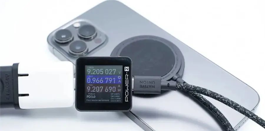 給iPhone 13Pro Max進行無線充電,使用ChargerLAB POWER-Z KM002C測得輸入功率為9.2V 0.97A 9.21W。