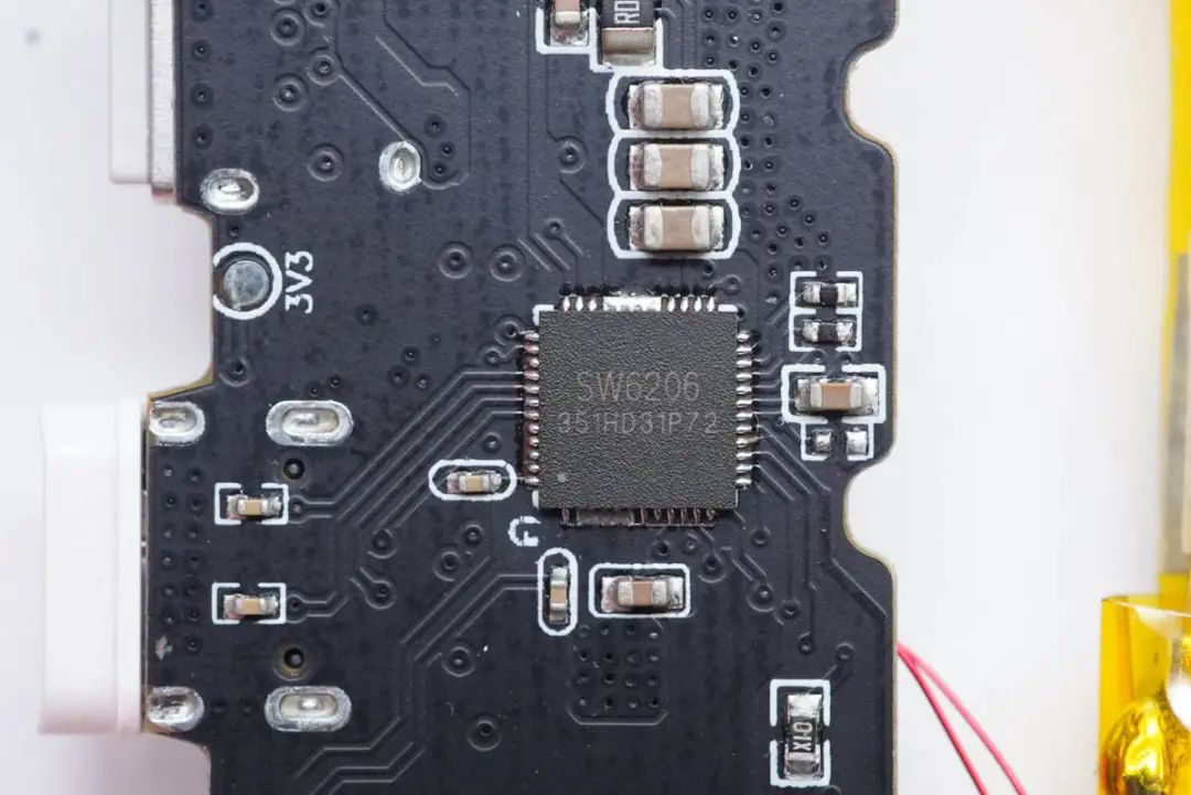 移動電源主控芯片采用智融SW6206。這是一款高集成度的多協(xié)議雙向快充移動電源專用多合一芯片,支持A+A+B+C+L口任意口快充。其集成了5A高效率開關(guān)充電,22.5W高效同步升壓輸出。
