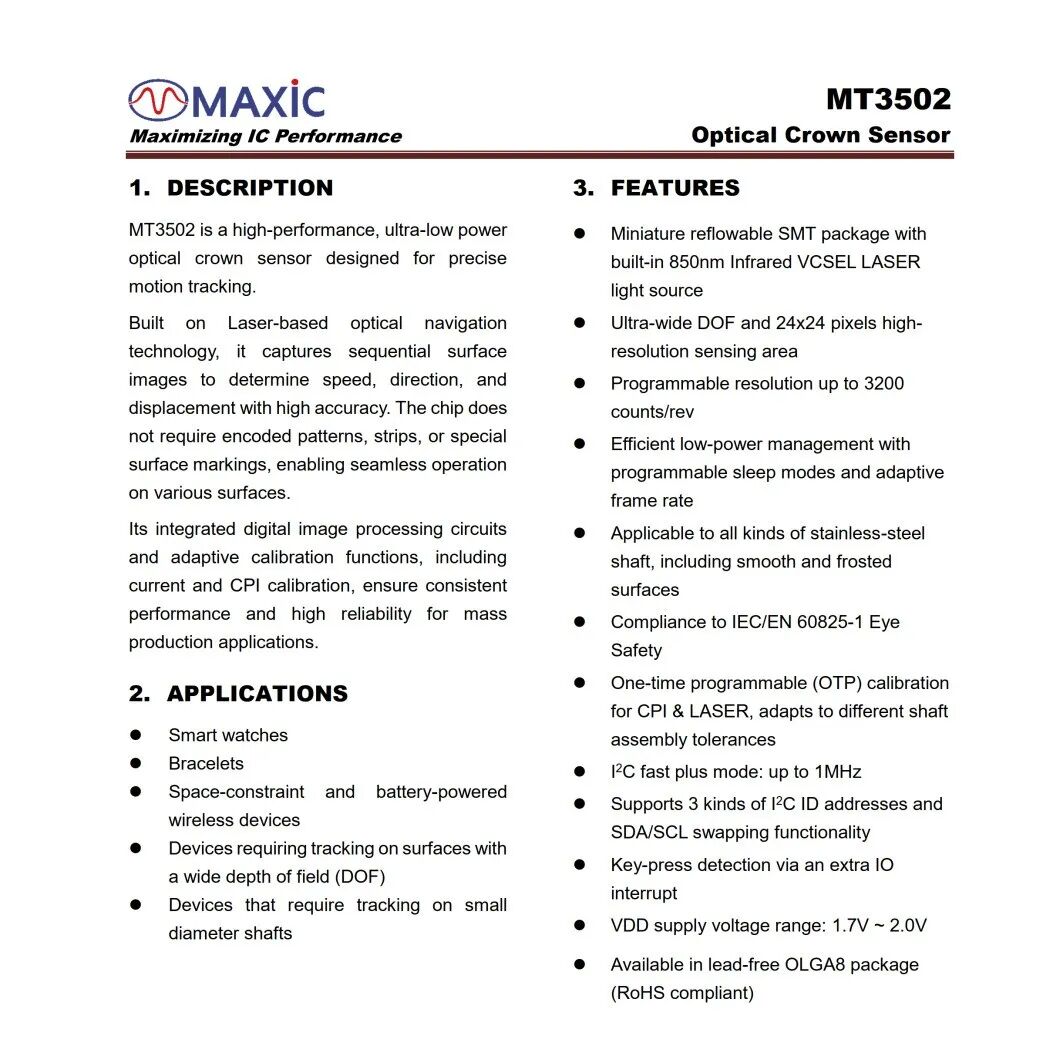 Maxic MT3502 is the industry’s first high-performance, ultra-low-power optical tracking sensor that integrates both rotational and key detection. It incorporates an 850 nm VCSEL emitter, an infrared receiver array, a high-precision ADC, and a high-speed digital image processing module. Featuring an integrated transceiver, high integration, high precision, ultra-low power consumption, convenient production testing, and rich functionality, it is primarily used for rotary and press detection in devices such as smartphones, smartwatches, and smart glasses.