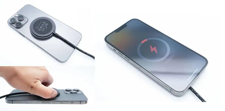 產品使用場景一覽,和iPhone13 Pro Max相比,顯得很小巧。另外產品可以輕松將蘋果這款手機吸附起來,吸附力很好。通電后可以正常給手機進行無線充電。