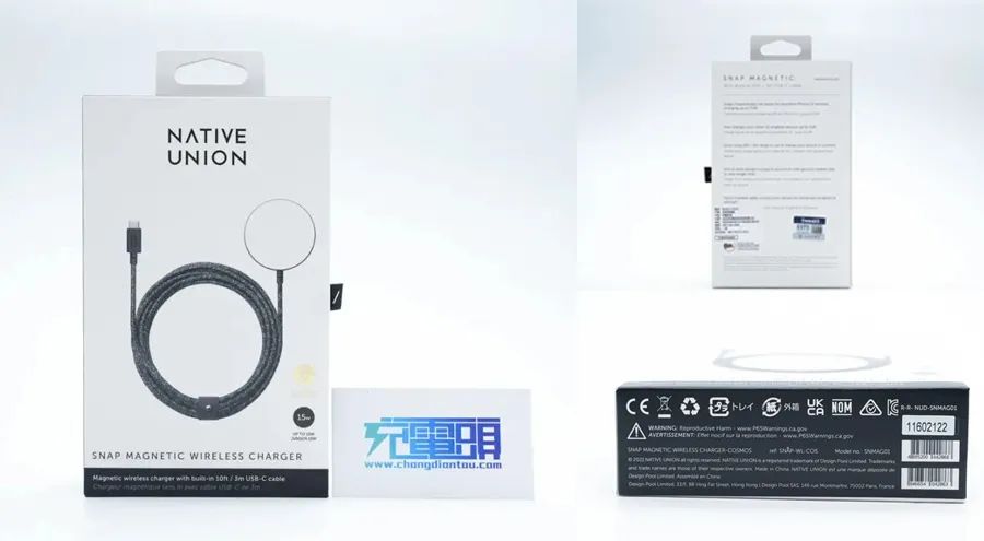 包裝盒正面印有Native Union品牌、產品外觀、名稱以及賣點,支持磁吸無線充以及15W功率;背面印有產品特性描述,此外還貼有信息貼紙以及防偽標簽;底部印有警示語、認證標識以及型號等信息。