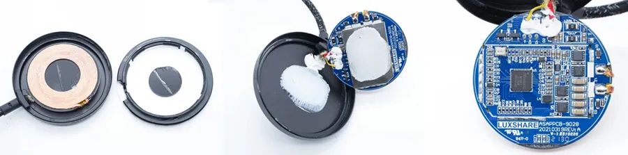 首先沿無線充外殼接縫撬開外殼,鋁合金外殼內部是無線充驅動電路以及線圈,白色面板固定在塑料支架上,與鋁合金外殼之間通過卡扣固定。電路板背面焊接屏蔽罩,屏蔽罩使用膠水固定在無線充電器外殼內部。無線充內置一塊圓形電路板,上方焊接輸入USB-C導線,右側焊接無線充電線圈,下方為指示燈焊盤,預留有指示燈的位置。