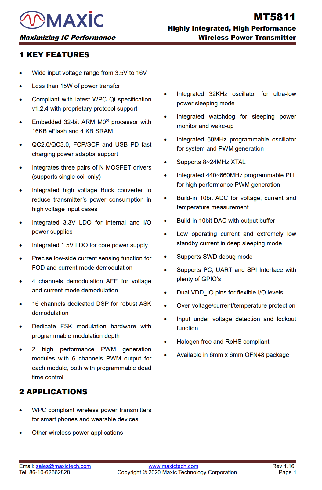 無線充電主控芯片采用美芯晟MT5811,這是一顆高度集成的無線充電SoC,支持3.5-16V寬范圍供電,支持小于15W的無線充電應用,芯片符合WPC Qi 1.2.4規(guī)范,并支持私有充電協(xié)議,芯片內部集成32位M0處理器,16KB eFlash和4KB SRAM。