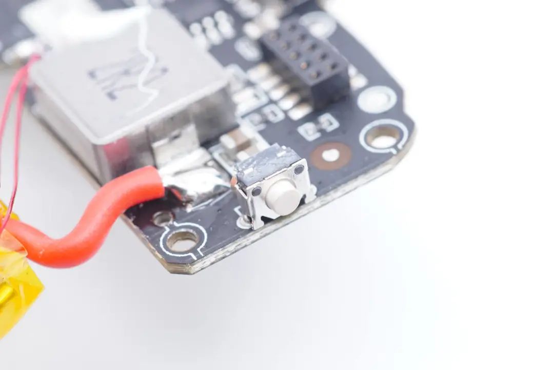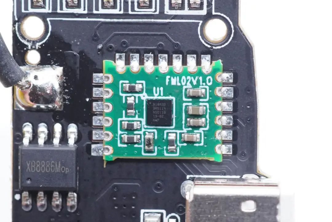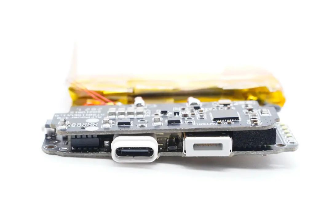 另一塊小板正面設(shè)有電感、接口保護MOS管、鋰電保護芯片等器件。