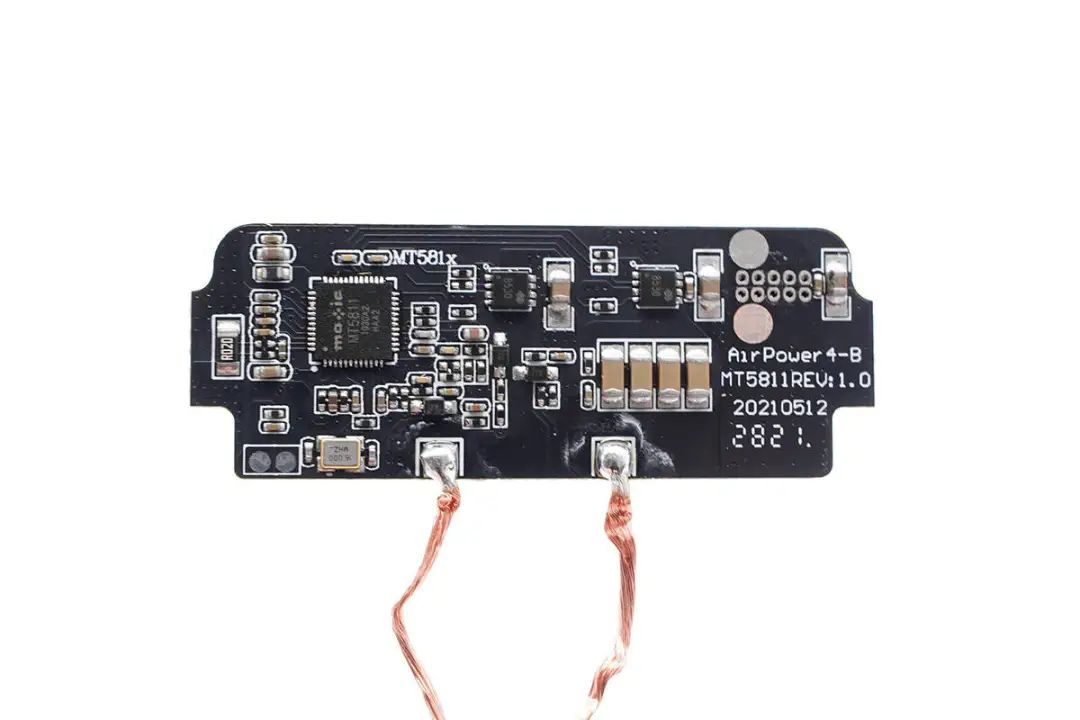 上層小板是無線充電路板,正面設(shè)有無線充電發(fā)射芯片、MOS管以及NPO諧振電容,并焊接無線充電線圈。