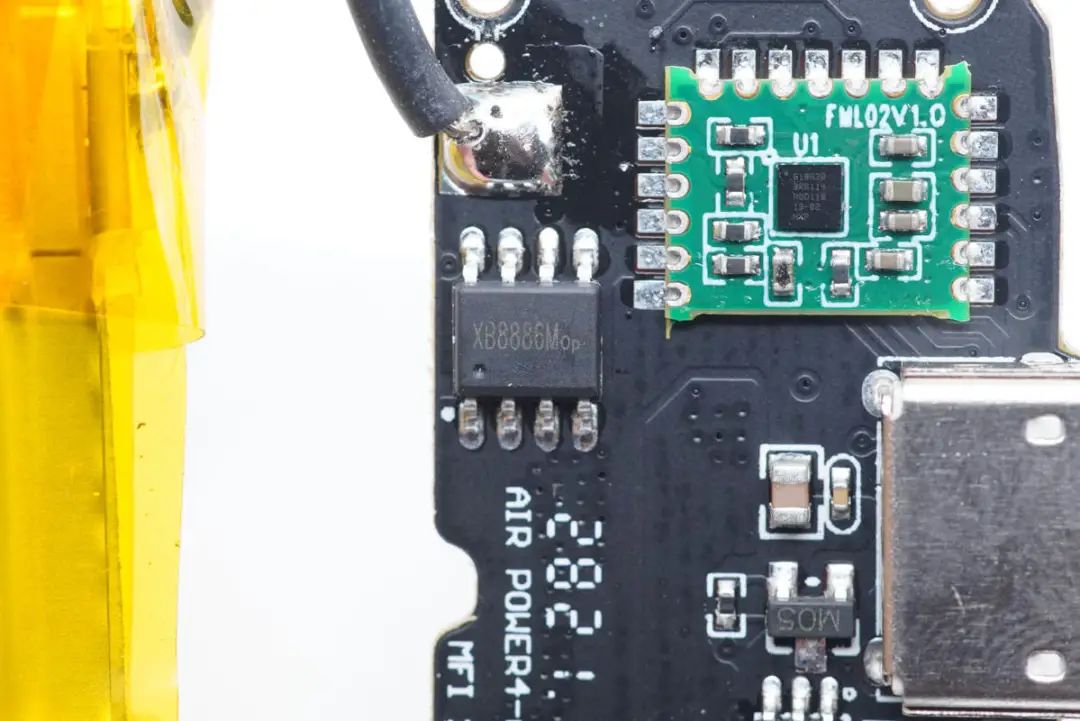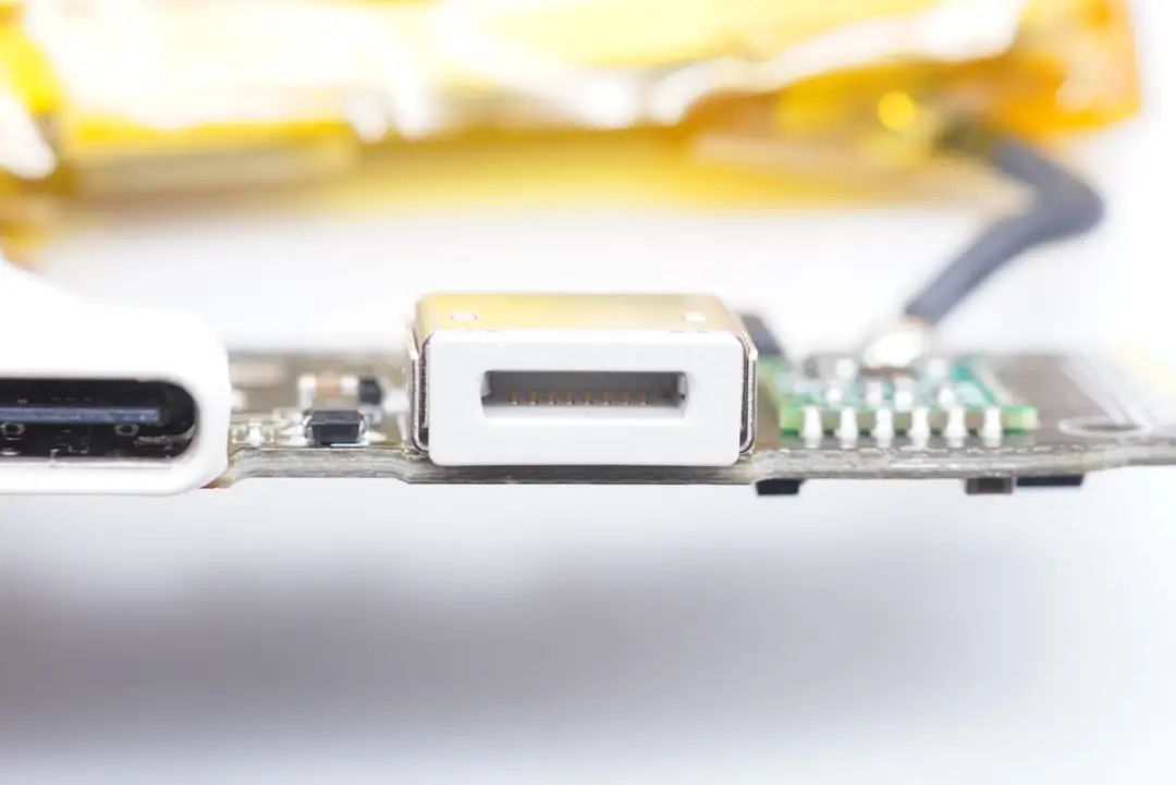 Lightning輸入口旁邊一顆芯片焊接在綠色小板上,絲印610A38,用于MFi認(rèn)證。