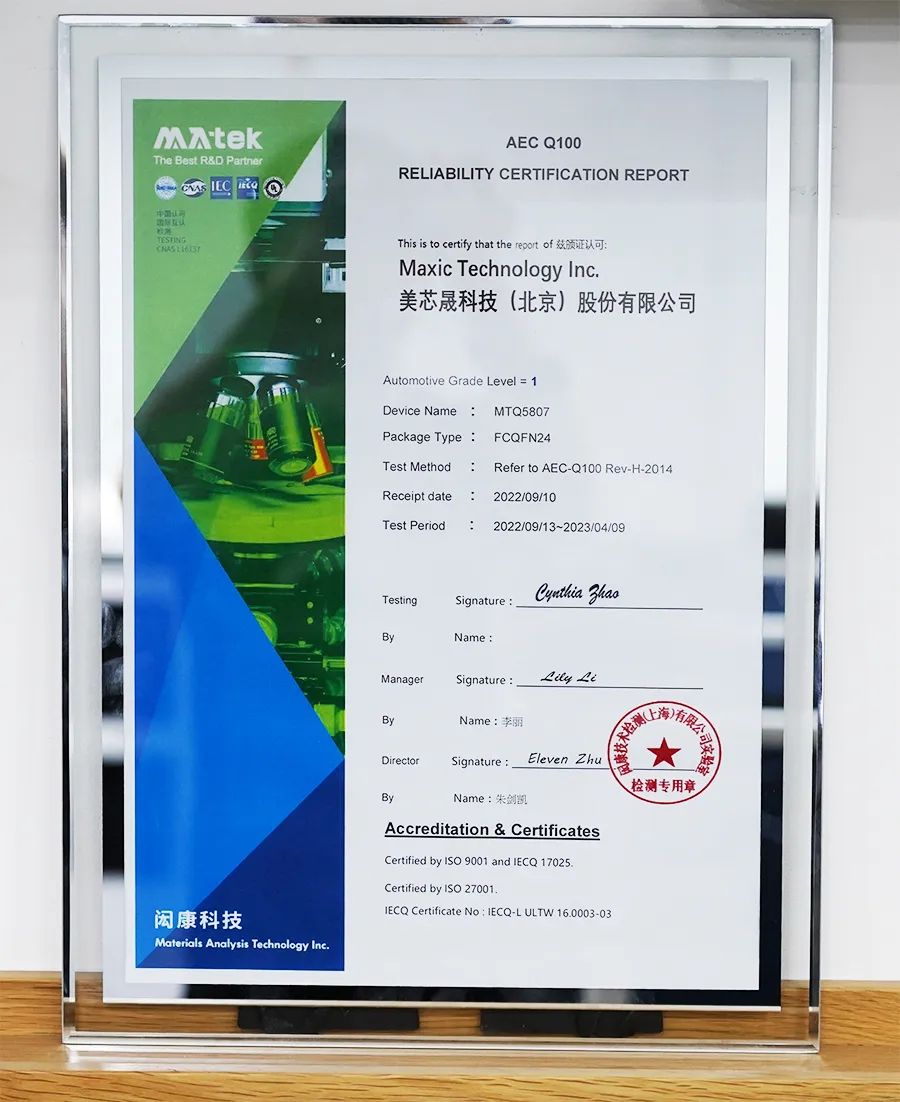 4月17日,美芯晟科技(北京)股份有限公司(以下簡(jiǎn)稱(chēng)“美芯晟”)與閎康技術(shù)檢測(cè)(上海)有限公司(以下簡(jiǎn)稱(chēng)“閎康科技”)成功在京舉辦了“AEC Q-100認(rèn)證報(bào)告”頒發(fā)儀式,美芯晟與閎康科技雙方多位重要代表共同出席了本次儀式。本次通過(guò)AEC Q-100標(biāo)準(zhǔn)認(rèn)證,是美芯晟向車(chē)規(guī)級(jí)芯片邁進(jìn)的重要一步,為加速布局汽車(chē)電子領(lǐng)域提供了強(qiáng)有力的基礎(chǔ)。