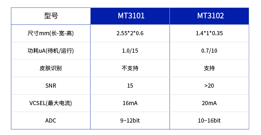 美芯晟最新推出的MT3102是一款超小尺寸、超低功耗、集成940nm VCSEL的數字光學接近傳感器,封裝尺寸僅有1.4mm*1mm*0.35mm,待機功耗低至0.7uA,配有公司自研高精度皮膚識別算法,有效提升入耳檢測效率,識別率>98%@3mm,對于常規(guī)的非皮膚組織,如桌子,書本,衣服,金屬等誤識率<5%@3mm,主要應用于 TWS/OWS等無線藍牙耳機、便攜式智能硬件產品、智能手表手機等。