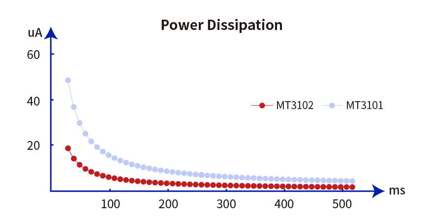 MT3102 is engineered with industry-leading power specifications, including operating/standby/sleep currents, where standby/sleep power<0.7μA, operating current<10μA@100ms (including VCSEL). The power has significantly decreased compared with the previous generation product, MT3101.