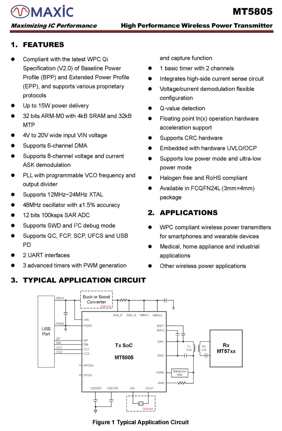 MT5805是單芯片解決方案,內(nèi)部集成32位M0處理器,32KB MTP存儲(chǔ)器和4KB SRAM,符合WPC Qi 2.0規(guī)范,支持無線充電私有協(xié)議,支持功能定制。芯片支持15W輸出功率,4-20V寬輸入電壓,內(nèi)置快充取電功能,支持UFCS融合快充、PD3.0、QC、FCP、SCP協(xié)議,支持單芯片無線充電器應(yīng)用,支持超低功耗工作模式。